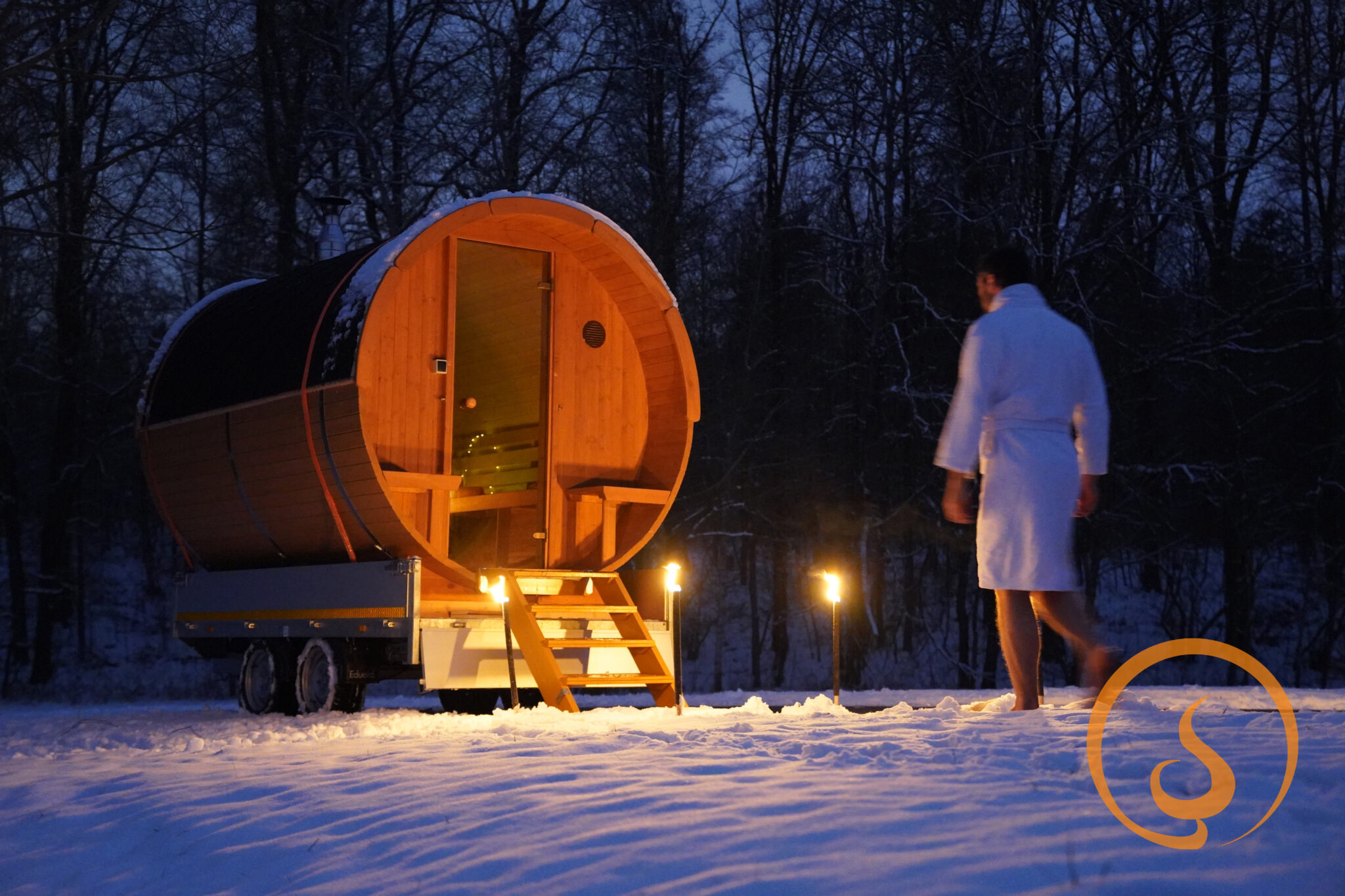 Wir liefern die mobile Fasssauna auf einem Anhänger nach einfacher Absprache.