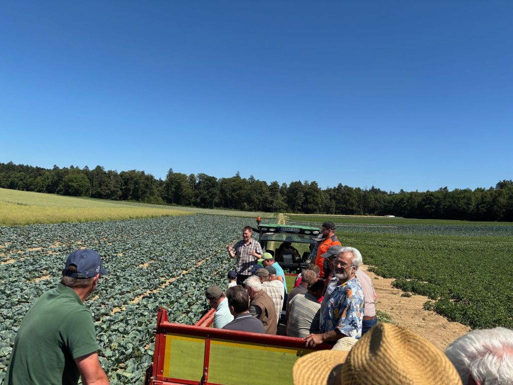 Auf Anhängern sitzend durchfuhren die Teilnehmenden die Markungen Rutesheim und Perouse mit Exklave und erfuhren dabei, dass die Kulturen – hauptsächlich Getreide, Mais, Raps, Kraut und Kartoffeln – dieses Jahr bis jetzt sehr gut stehen. Die Landwirte zeigten unterwegs anschaulich, dass der termingenaue, dosierte Einsatz von Fungiziden und Herbiziden unverzichtbar ist, da sonst Unkräuter und Pilze gedeihen und die Ernte erheblich geringer, wenn nicht sogar ganz ausfällt.