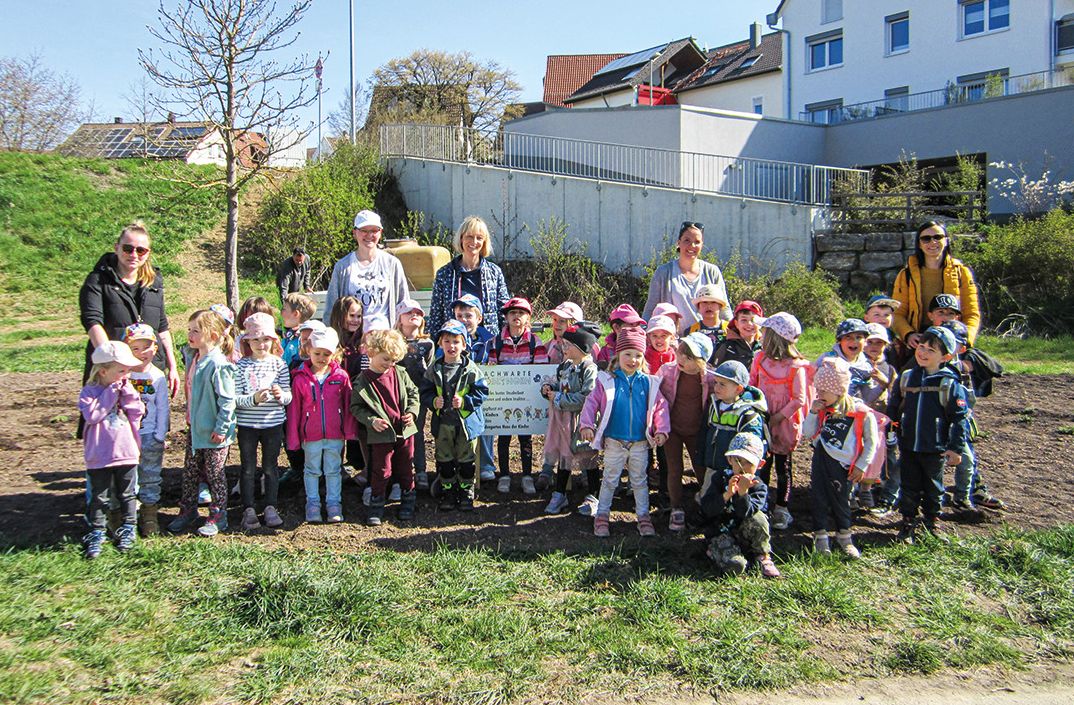 Ein besonderes Highlight der Aktion war die tatkräftige Unterstützung der rund 40 Kinder aus dem Kindergarten „Haus der Kinder“. Gemeinsam mit ihren Erzieherinnen pflanzten die Kinder über 60 bienenfreundliche Stauden. Begrüßt wurden sie vom Ersten Beigeordneten der Stadt Rutesheim, Martin Killinger. Die fachliche Begleitung übernahm Manfred Nuber, Fachberater für Obst- und Gartenbau im Landkreis Böblingen.