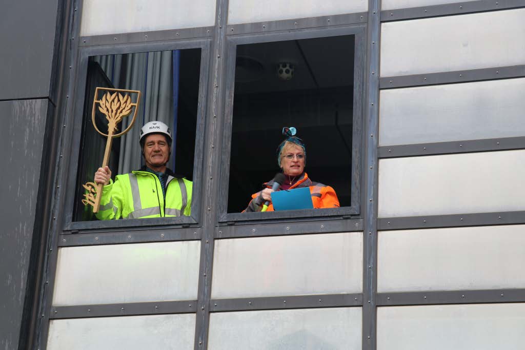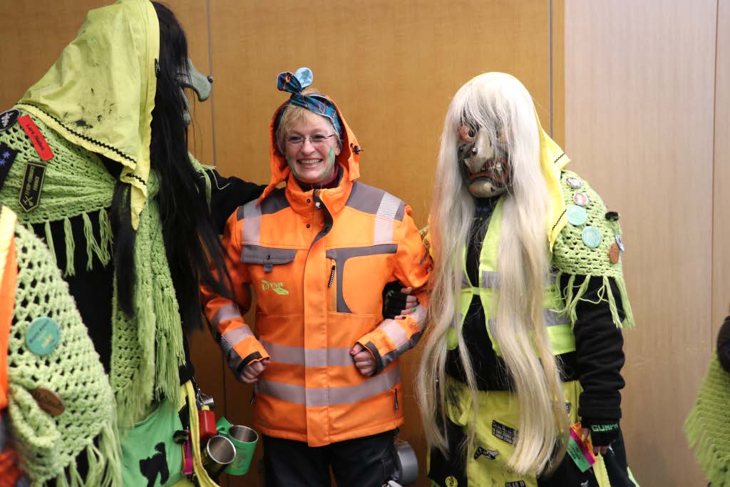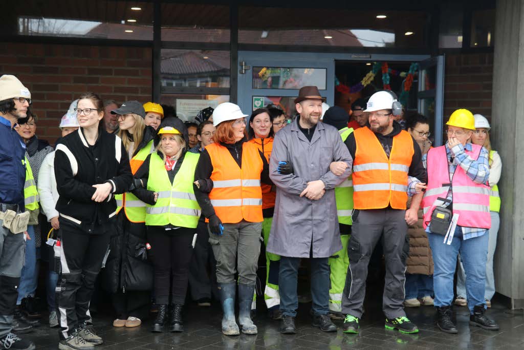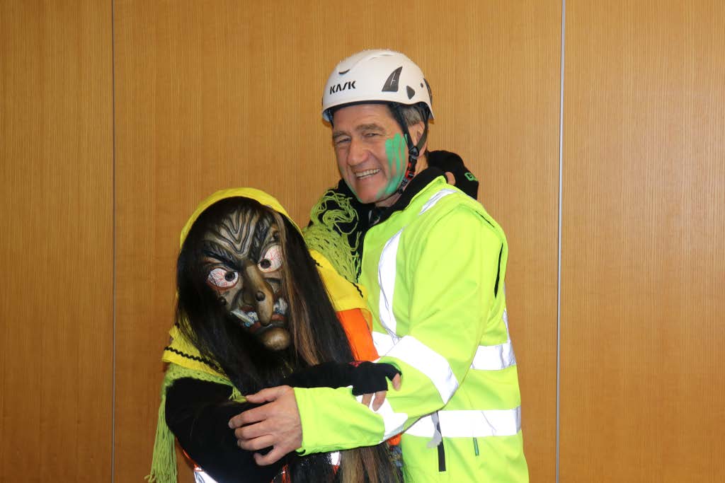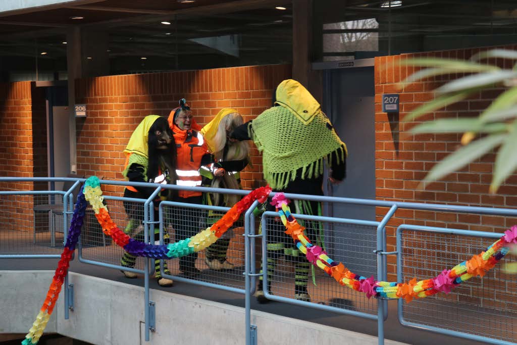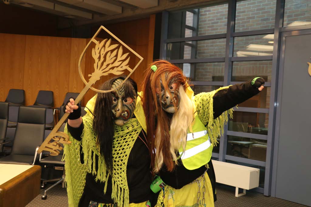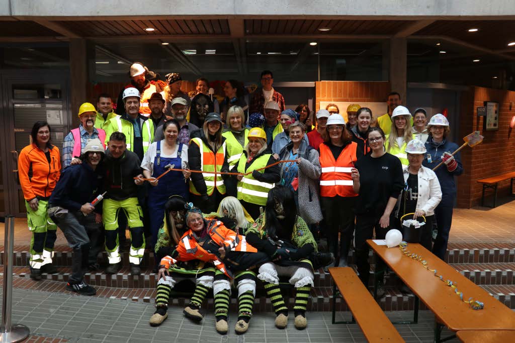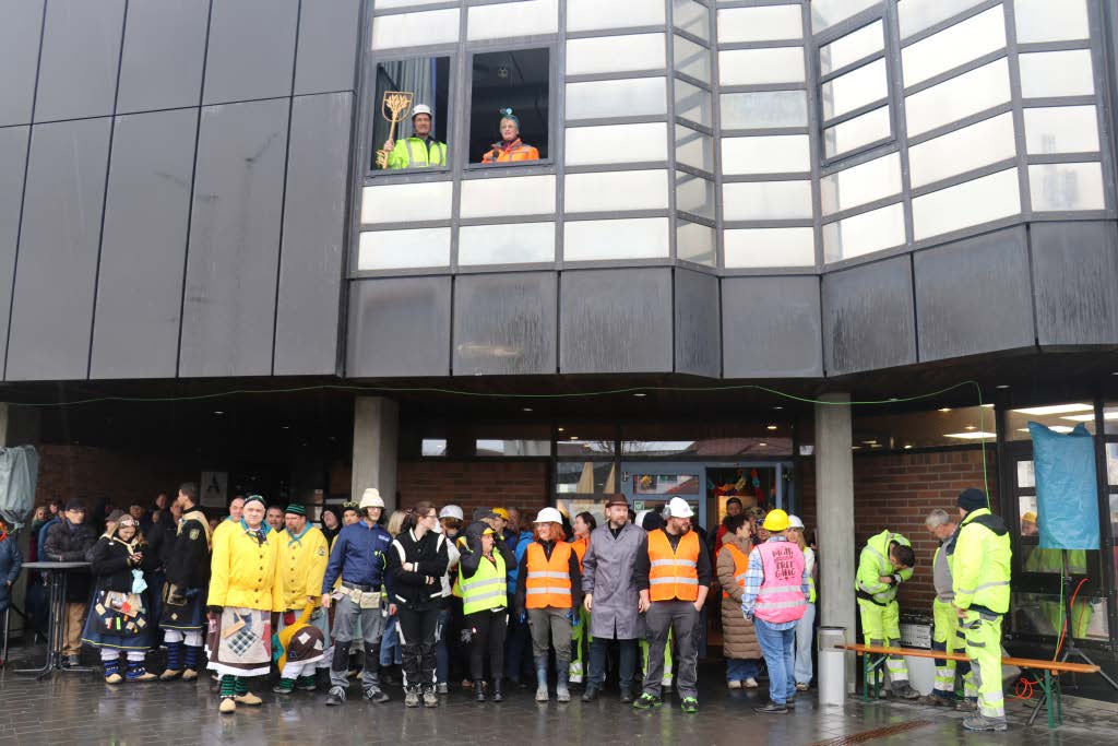 Wie in jedem Jahr versammelten sich die Rathausmitarbeiterinnen und -mitarbeiter geschlossen vor dem Rathaus, um den närrischen Ansturm abzuwehren. In diesem Jahr stand alles unter dem Motto „Schafferinnen und Schaffer“ – inklusive Bürgermeisterin und Erstem Beigeordneten, die sich ebenfalls passend kostümiert hatten. Während unten vor dem Rathaus die Verteidigung Stellung bezog, blickten die beiden zunächst noch selbstbewusst aus dem Sitzungssaalfenster auf das bunte Treiben herab. Nach der traditionellen Anklage der Narren konterte die Bürgermeisterin schlagfertig – sehr zur Freude der zahlreichen Zu-schauerinnen und Zuschauer. Doch allen Widerstandsversuchen zum Trotz ließen sich die Ruademser Gumpa Hexa nicht aufhalten: Mit viel Humor, lautstarker Unterstützung und närrischer Entschlossenheit wurde das Rathaus schließlich gestürmt, der Stadtschlüssel übernommen und die Rathausspitze symbolisch festgesetzt.