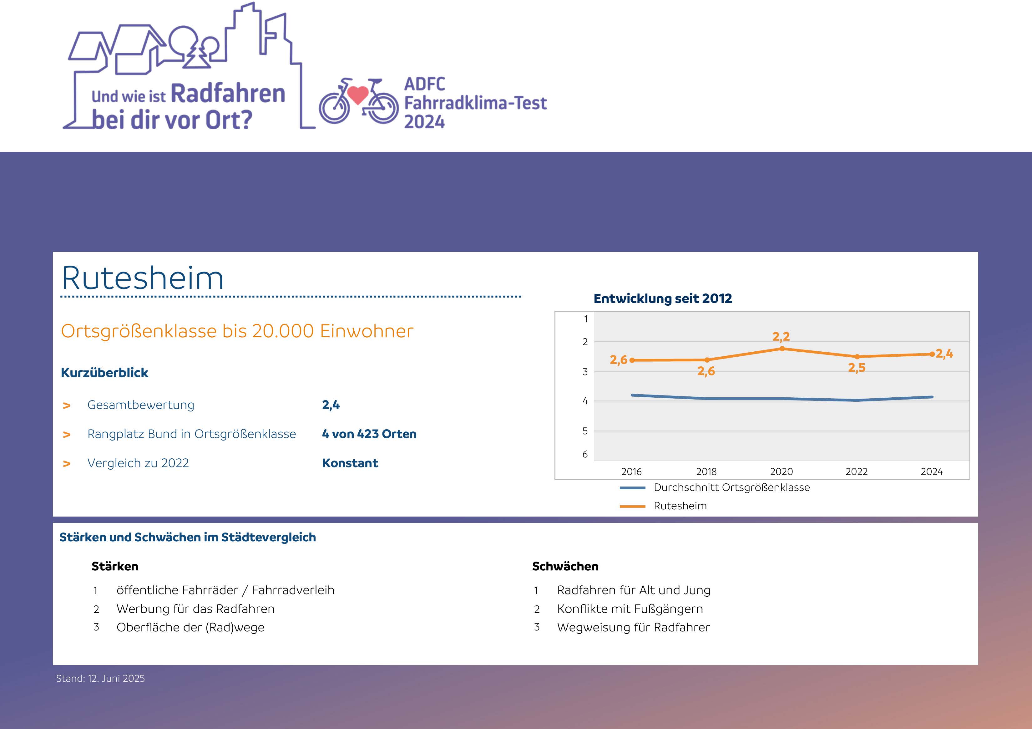 Rutesheim ist die fahrradfreundlichste Stadt Baden-Württembergs! Das ergab der jüngste Fahrradklimatest, zu dem der Allgemeine Deutsche Fahrrad-Club (ADFC) alle zwei Jahre aufruft. Betrachtet man den bundesweiten Notenschnitt von 3,92 liegt Rutesheim mit der Gesamtnote 2,4 (2022: 2,5) deutlich besser und erzielte damit nicht nur die beste Bewertung im Land Baden-Württemberg, sondern landete selbst bundesweit auf dem vierten Platz unter 423 Orten mit weniger als 20.000 Einwohnern. Bei den Zusatzfragen „Miteinander im Verkehr“ gab es bundesweit den dritten Platz.
