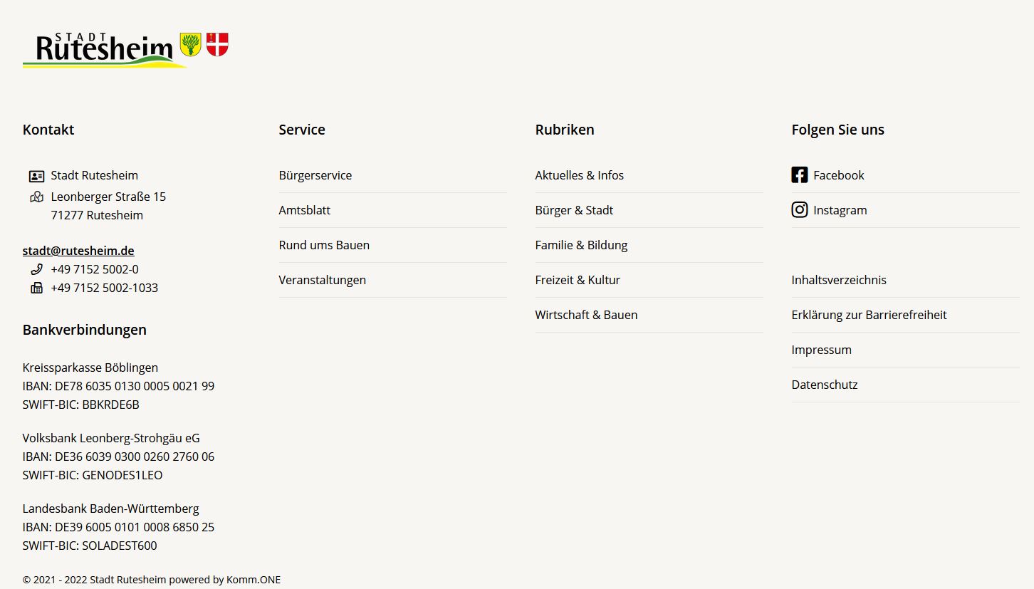 Unter "Kontakt" steht unsere Adresse. Hier steht auch die E-Mail Adresse, die Telefon-Nummer, die Fax-Nummer. Hier stehen auch die Bankverbindungen der Stadt Rutesheim.