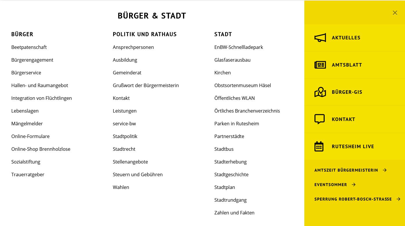 Das Menü hat 2 Bereiche. Einen weißen linken Bereich. Einen gelben rechten Bereich.